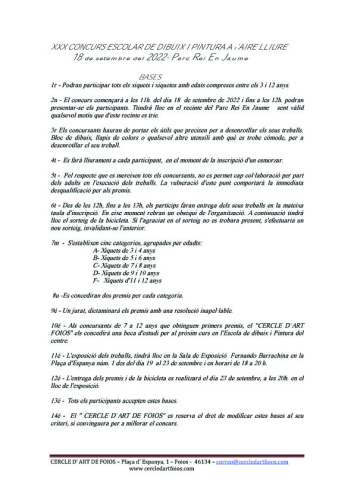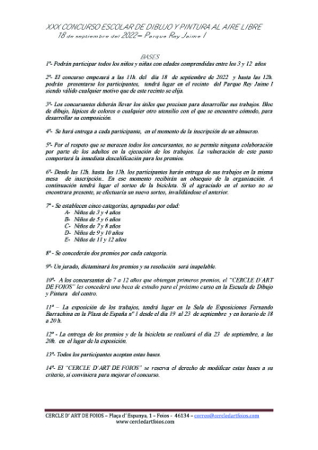 SE APLAZA A LAS 16 H. EN EL MISMO SITIO Volvemos a nuestra cita anual, con la misma ilusión y un poquito más si cabe, de años anteriores. El próximo domingo 18 estaremos a partir de las 16h. en la Plaza Rey Jaime I esperando ver los dibujos que realicéis, durante esa mañana los escolares de 3 a 12 años. Habrá 10 premios dos para cada una de las categorías, agrupadas por tramos de edad; todos los participantes tendrán un detalle y un almuerzo. También participaran en el sorteo de una bicicleta que celebraremos esa misma mañana a las 13 h. Esta actividad despierta el lado más creativo de nuestros escolares, Pueden expresar sus sentimientos y emociones durante una entretenida mañana de domingo. BASES 1ª- Podrán participar todos los niños y niñas con edades comprendidas entre los 3 y 12 años 2ª- El concurso empezará a las 16h. del día 18 de septiembre de 2022 y hasta las 12h. podrán presentarse los participantes, tendrá lugar en el recinto del Parque Rey Jaime I siendo válido cualquier motivo que de este recinto se elija. 3ª- Los concursantes deberán llevar los útiles que precisen para desarrollar sus trabajos. Bloc de dibujo, lápices de colores o cualquier otro utensilio con el que se encuentre cómodo, para desarrollar su composición. 4ª- Se hará entrega a cada participante, en el momento de la inscripción de un almuerzo. 5ª- Por el respeto que se merecen todos los concursantes, no se permite ninguna colaboración por parte de los adultos en la ejecución de los trabajos. La vulneración de este punto comportará la inmediata descalificación para los premios. 6ª- Desde las 16h. hasta las 17h. los participantes harán entrega de sus trabajos en la misma mesa de inscripción.. En ese momento recibirán un obsequio de la organización. A continuación tendrá lugar el sorteo de la bicicleta. Si el agraciado en el sorteo no se encontrara presente, se efectuaría un nuevo sorteo, invalidándose el anterior. 7ª - Se establecen cinco categorías, agrupadas por edad: A- Niños de 3 y 4 años B- Niños de 5 y 6 años C- Niños de 7 y 8 años D- Niños de 9 y 10 años E- Niños de 11 y 12 años 8ª - Se concederán dos premios por cada categoría. 9ª- Un jurado, dictaminará los premios y su resolución será inapelable. 10ª- A los concursantes de 7 a 12 años que obtengan primeros premios, el “CERCLE D`ART DE FOIOS” les concederá una beca de estudio para el próximo curso en la Escuela de Dibujo y Pintura del centro. 11ª – La exposición de los trabajos, tendrá lugar en la Sala de Exposiciones Fernando Barrachina en la Plaza de España N.º 1 desde el día 19 al 23 de septiembre y en horario de 18 a 20 h. 12ª - La entrega de los premios y de la bicicleta se realizará el día 23 de septiembre, a las 20h. en el lugar de la exposición. 13ª- Todos los participantes aceptan estas bases. 14ª- El “CERCLE D`ART DE FOIOS” se reserva el derecho de modificar estas bases a su criterio, si conviniera para mejorar el concurso.